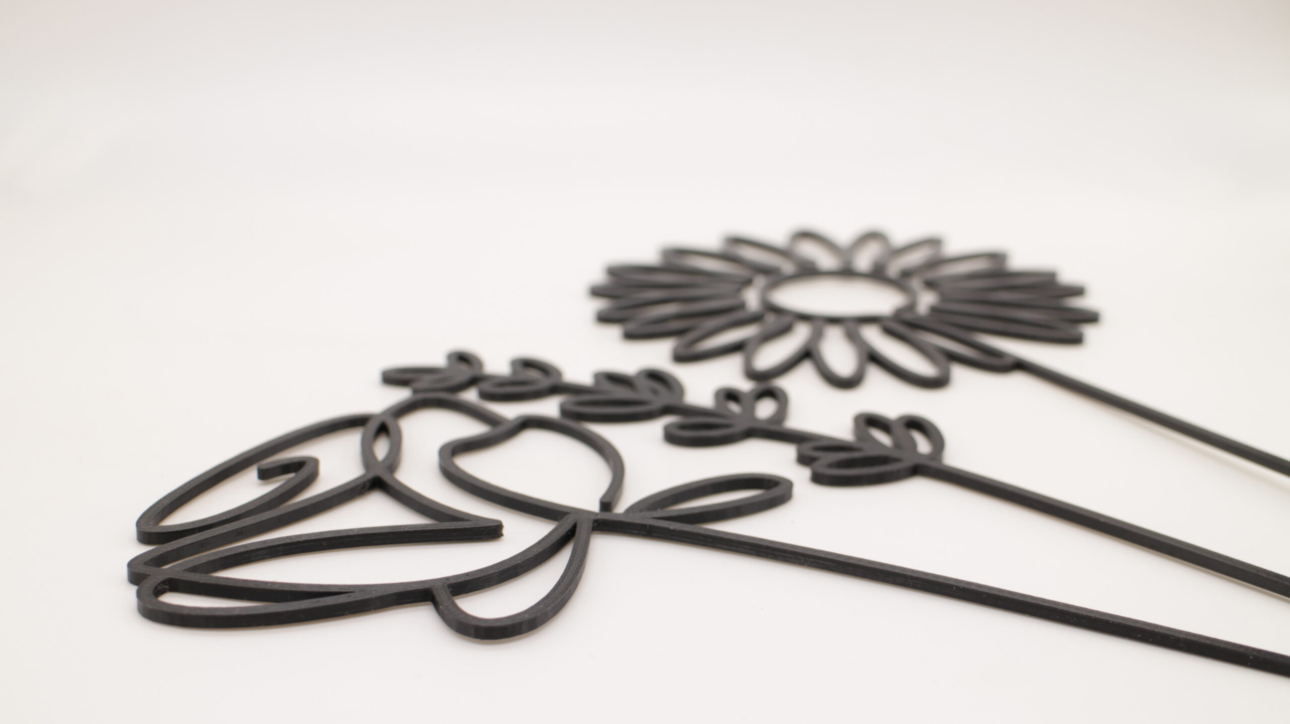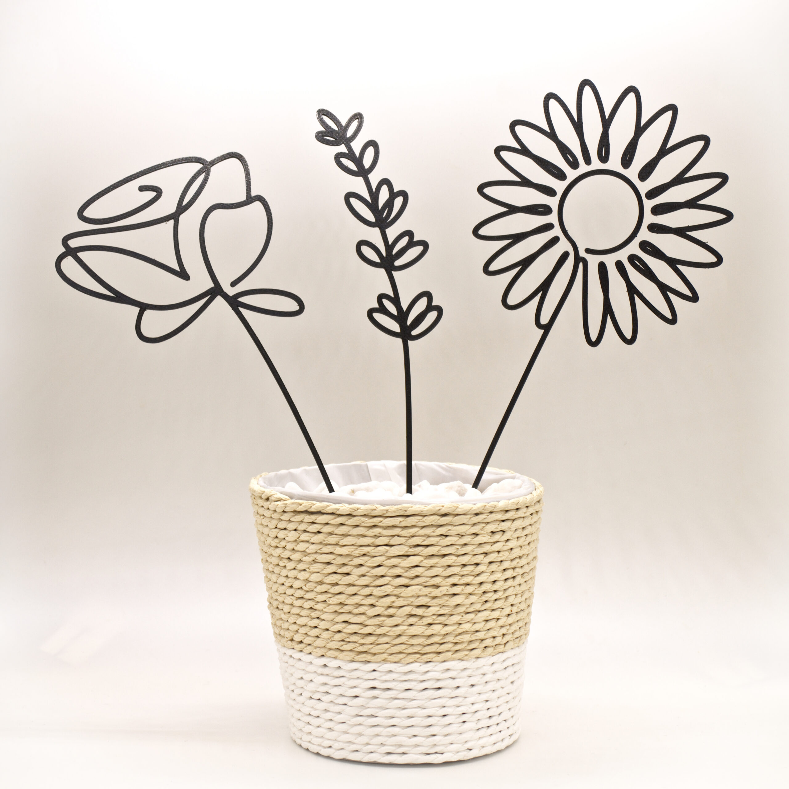 El conjunto incluye tres flores negras estilo trazo a mano: una rosa elegante, una margarita radiante y un helecho estilizado, creadas con líneas limpias y modernas que aportan carácter y distinción. Su estética tipo ilustración 2D convierte una pieza sencilla en un verdadero punto focal decorativo.